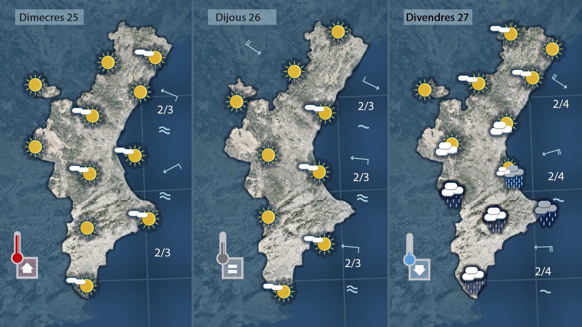 Oratge estable amb temperatures suaus que es mantindrà amb tota seguretat fins divendres quan alguns models tornen a donar una inestabilitazació de l’oratge a la mitad sud de la Comunitat que caldrà confirmar els pròxims dies.