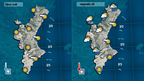Demà dijous serà l’ultim dia d’este període d’inestabilitat i tronades que ens acompanya les últimes setmanes. El matí serà un poc més fresc perquè està previst que les temperatures nocturnes baixen lleugerament però al centre del dia farà un poc més de calor sobretot al centre i per l’interior on el mercuri dels termòmetres fregarà els 30 gruas.