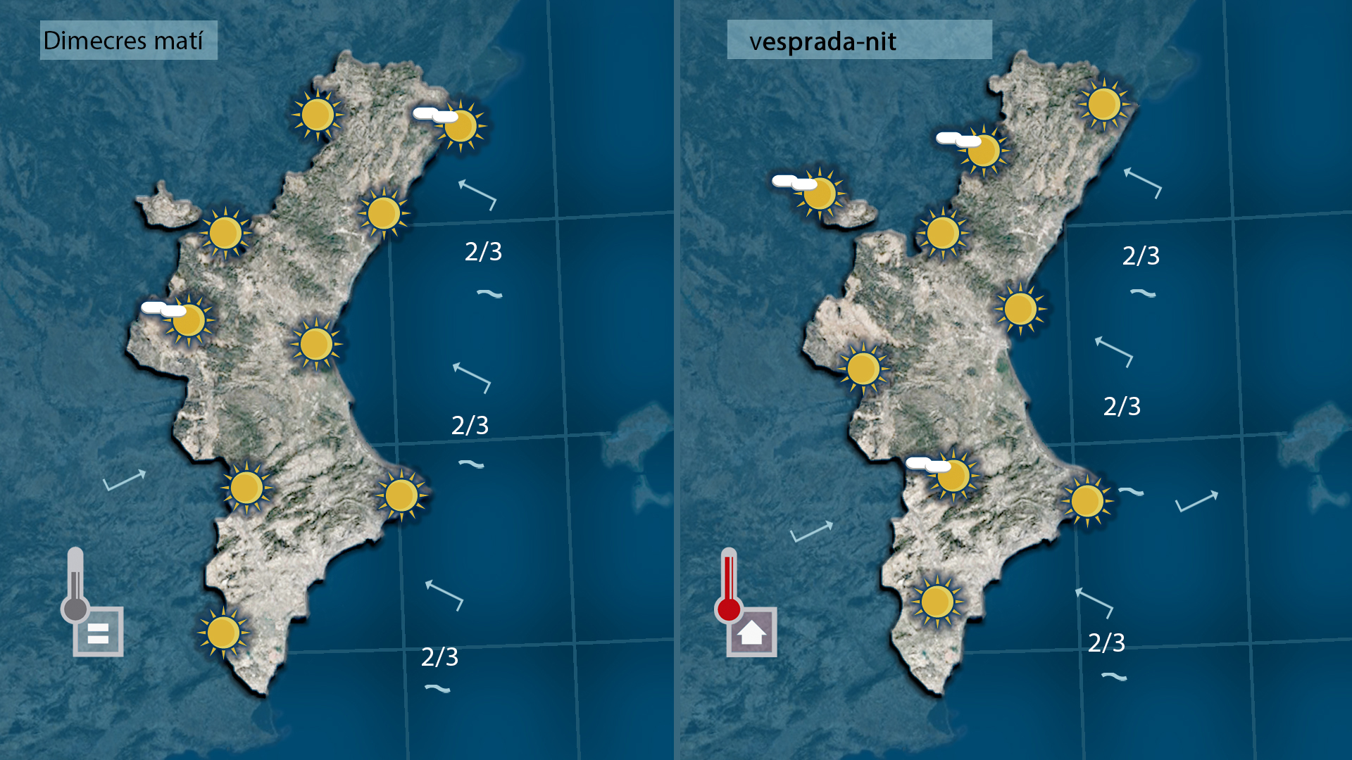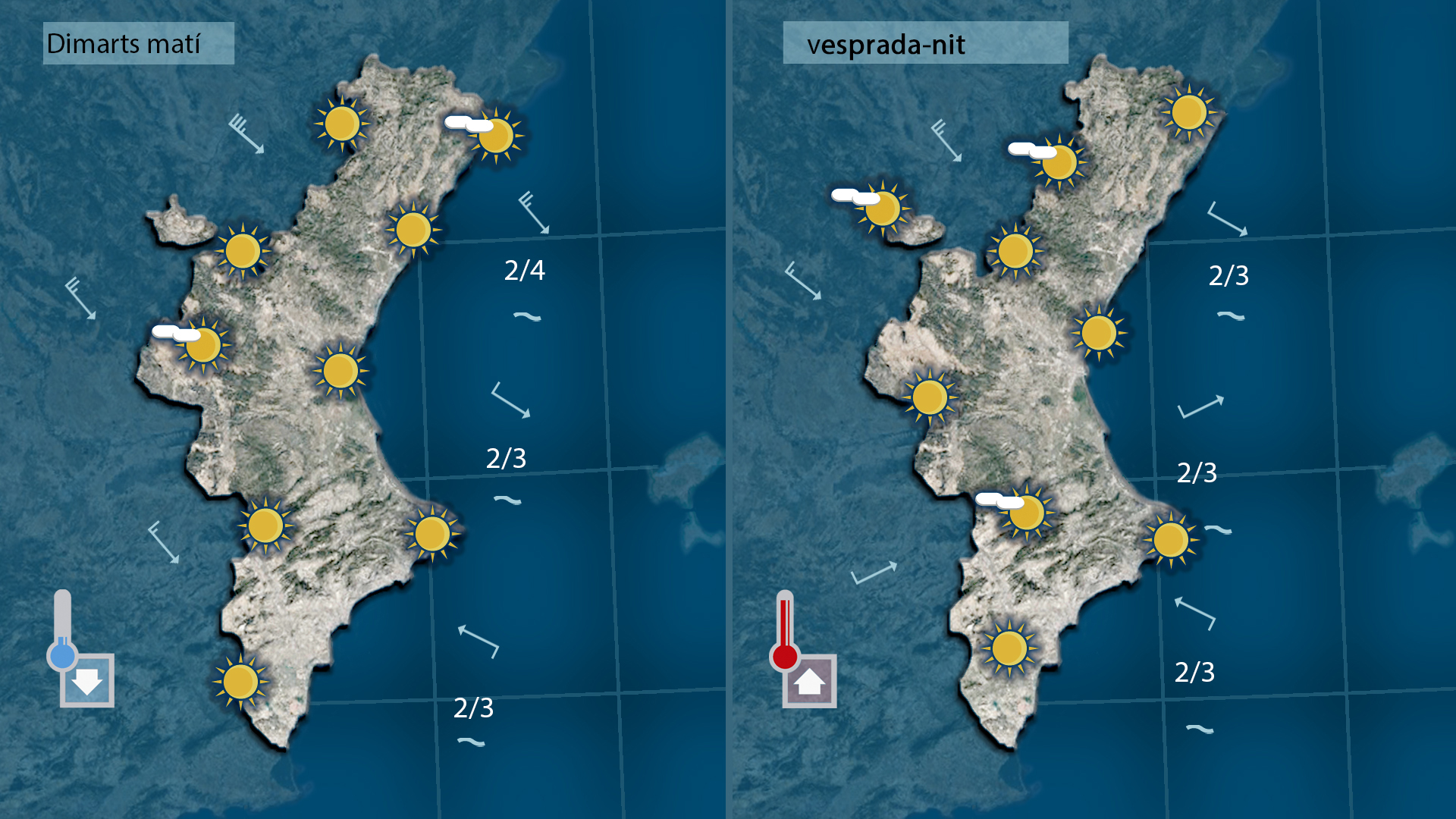 A primera hora encara es deixva sentir el mestral al nord però no tardarà en encalmar i amb el cel ras la nit ha sigut més fresca però al centre del dia començaran a pujar les temperaures