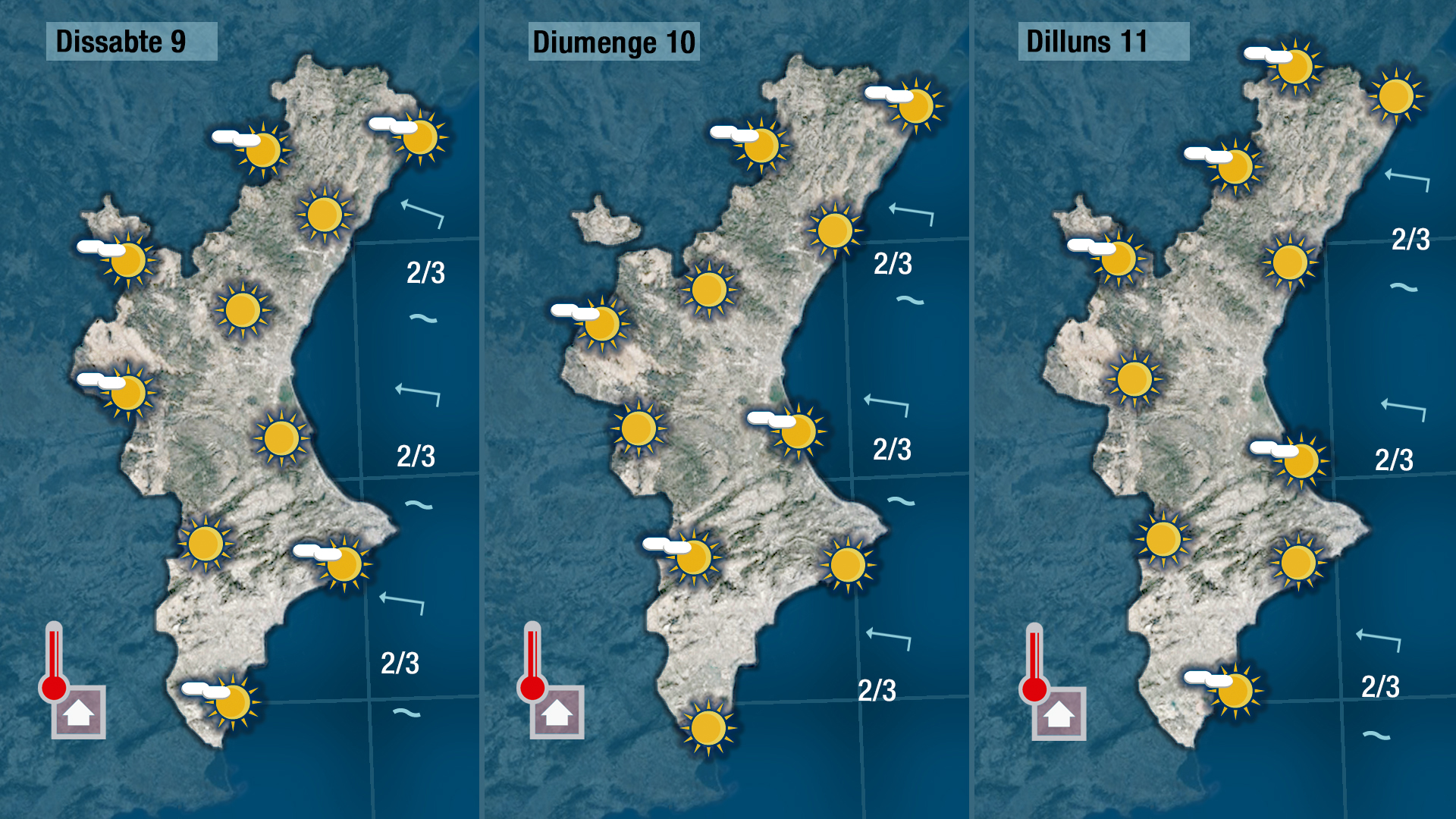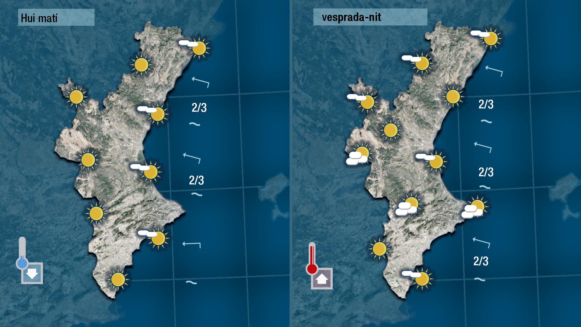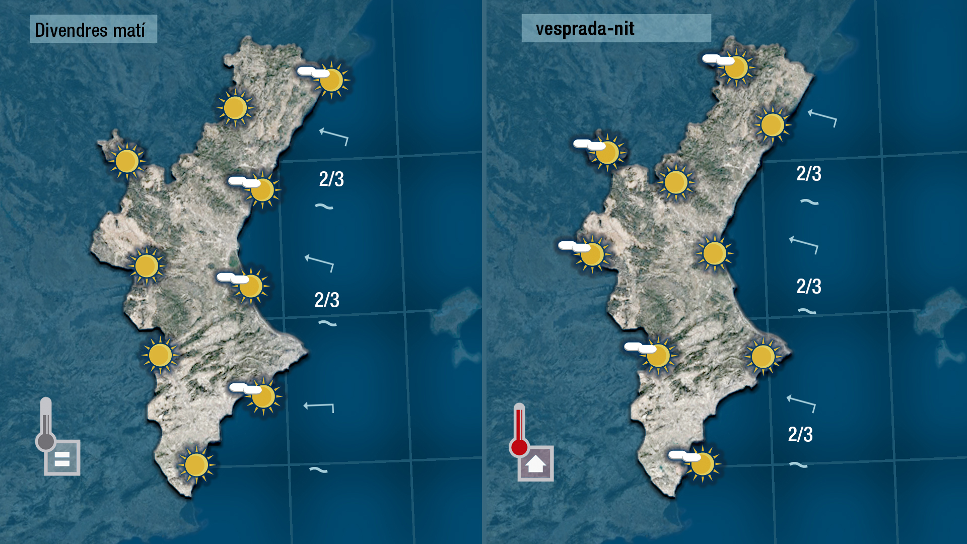 Demà divendres vorem pocs núvols al cel i les temperatures continuaran pujant. L’ascens serà més tímid a la costa i més marcat per l’interior on a migdia o primera hora de la vesprada els termòmetres arraparan els 35 graus