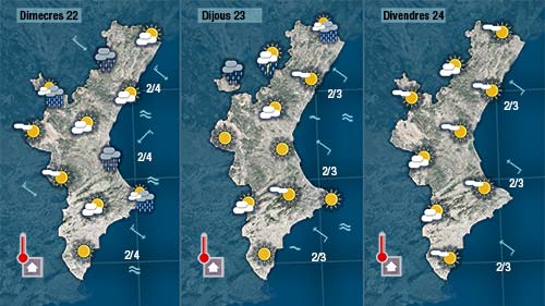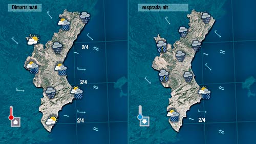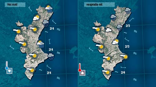 Fins a migdia el vent bufarà de mesral i ponent la qual cosa també afavorirà un ascens de les temperatures. De vesprada al nord i al centre podrà girar el vent a gregal i propiciar l’aparició de núvols i de pluja.