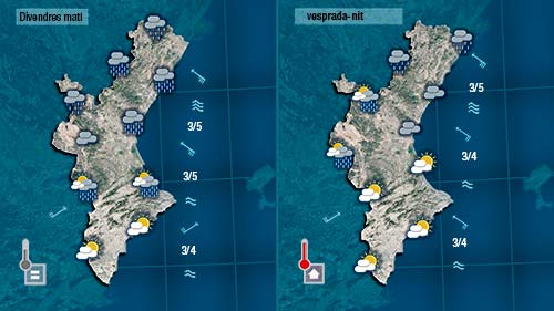 Pot ser a primera hora encara tindrem ullades de sol, però els núvols i la pluja no tardaran a entrar des de l’est deixant els primers ruixats cap al migdia. Le sprecipitacions més intenses i els avisos meteorològics començaran a estar vigents de vesprada quan la intensitat de les precipitacions podrà ser forta o molt forta (sembla que les zones més afectades seran les del litoral i prelitoral de la mitad nord de la Comunitat).