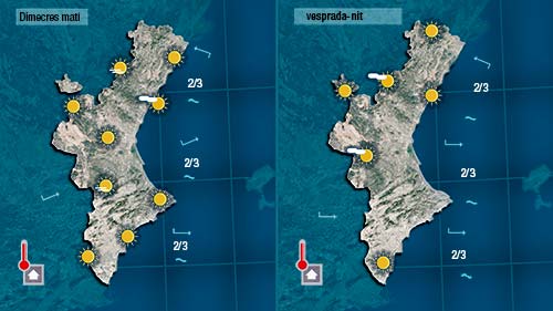 Tampoc són massa bones les notícies que portem per a demà dimecres perquè continuem parlant d’altes pressions que ubicades al sud de la Península enviaran vents de ponent cap ací fent pujar un poc més les temperatures.