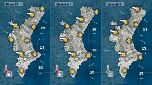 El fluxe de ponents els mantindrà la resta de la setmana mantenint altes les temperatures per tot arreu. Pots de forma puntual en punts de la costa puga fer més fresca a apartir de migdia si entra la brisa però poc més podrem destacar d’un oratge que continua ‘desesperant-nos’