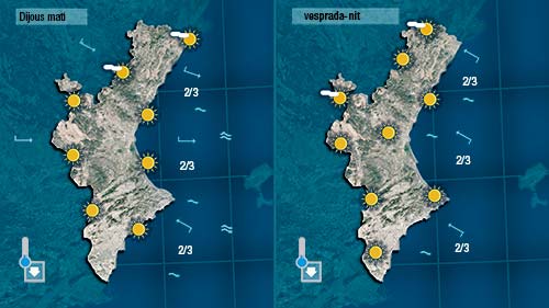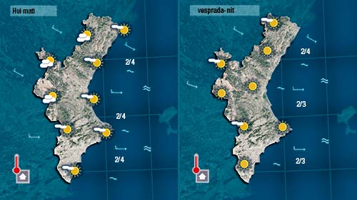 Demà dijous només podem anunciar un nou descens de les temperatures perquè a primera hora encara es deixarà senrir el ponent però a poc a poc encalmarà deixant pas al xaloc (vent del sud-est més humit i fresc).