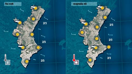 Demà dimarts començarem a notar els canvis al nord i a partir de la vesprada quan un front de núvols ens creue de nord a sud portant una massa d’aire més freda. De tota manera, abans que arribe el front el vent bufarà de ponent i tindrem damunt de nosaltres la part càlida, la que va davant del front i això encara deixarà les temperatures molt altes en punts de la costa, al centre i al sud de la Comunitat.