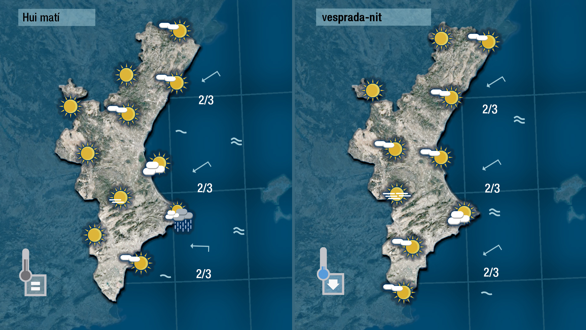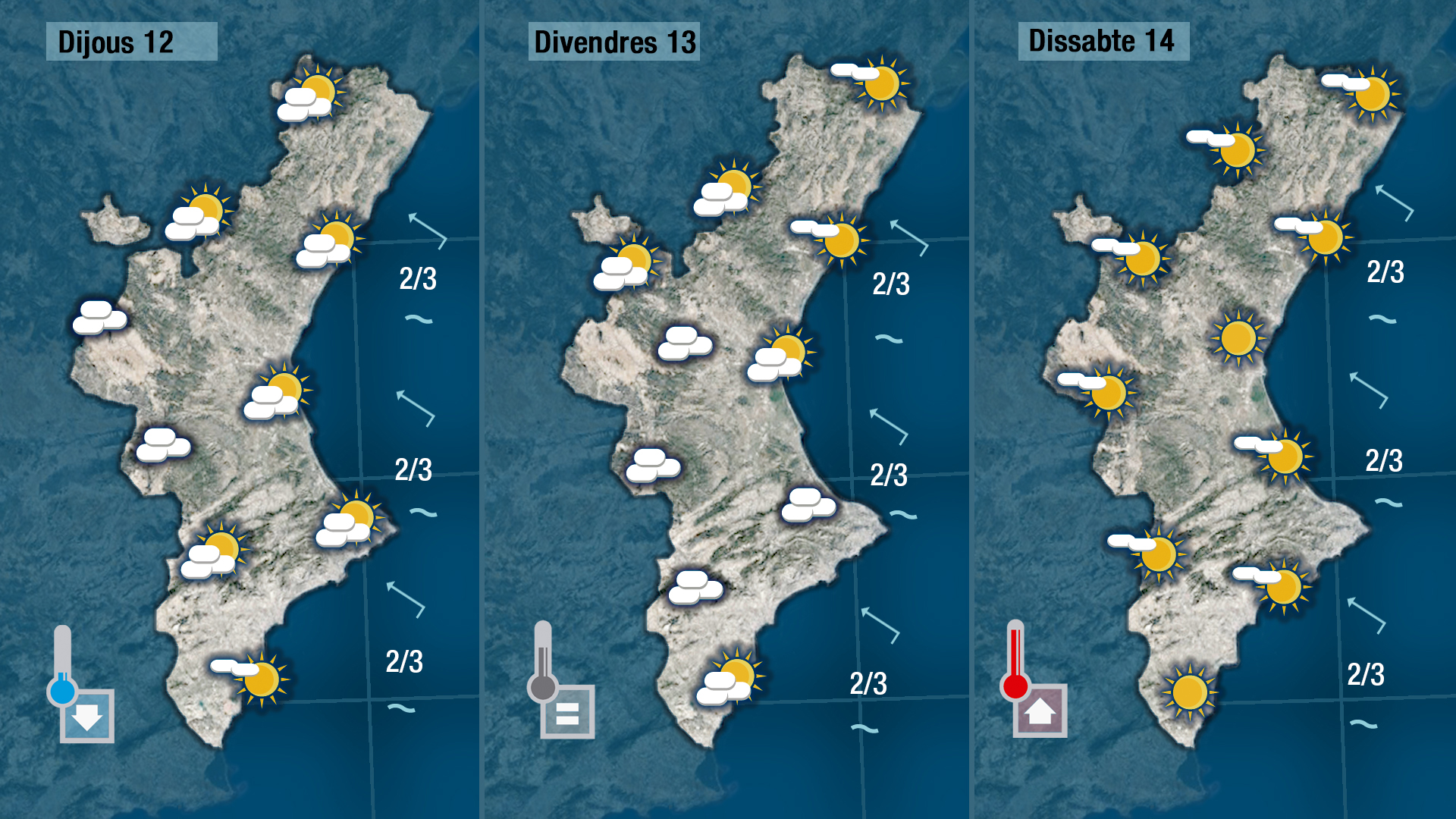 Els núvols seran hui més abunants en punts de la costa on fins i tot podria escapar-se alguna gota. Les temperatures mínimes apenes han patit canvis iperò les màximes baixaran dos o tres graus.