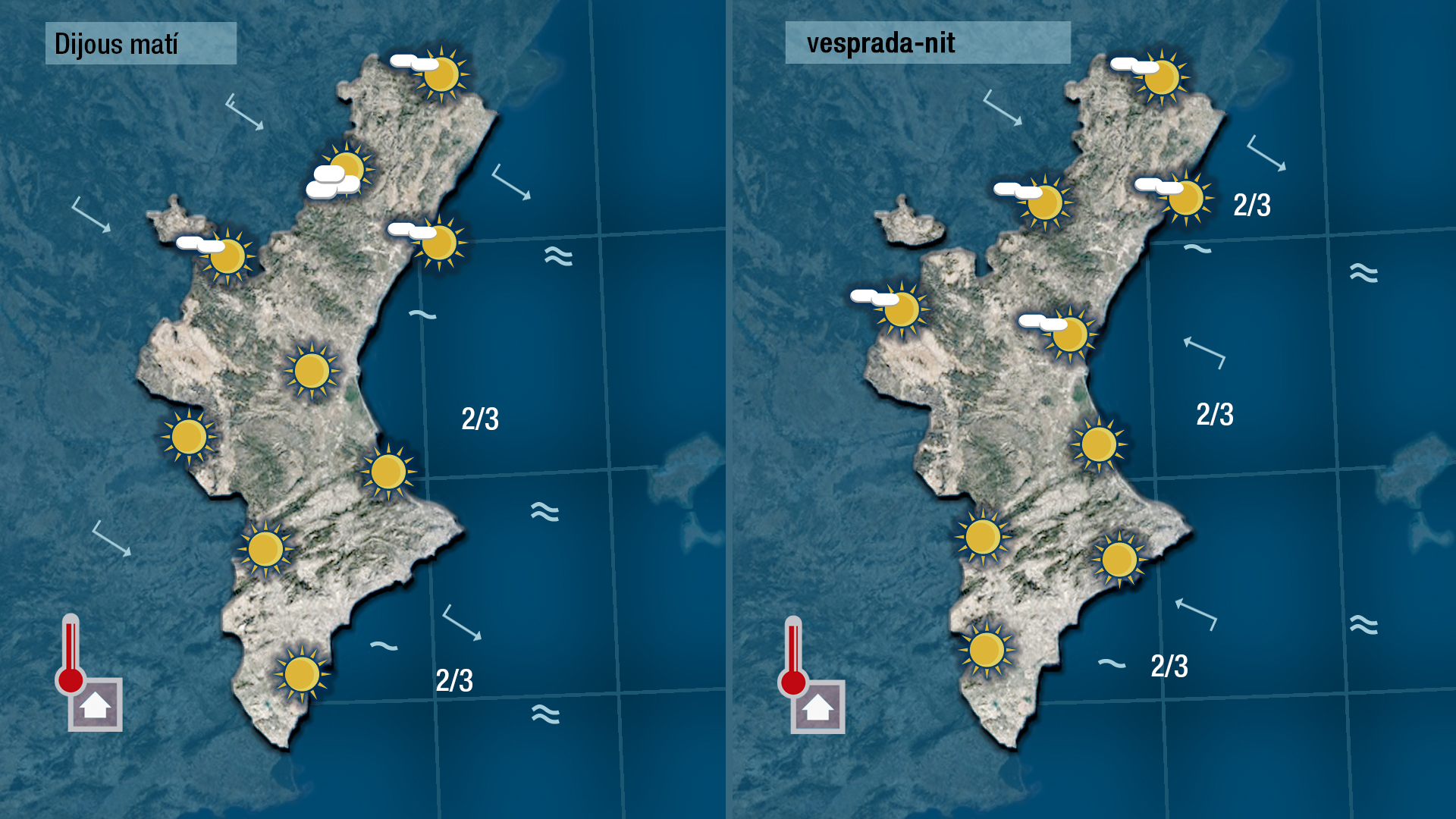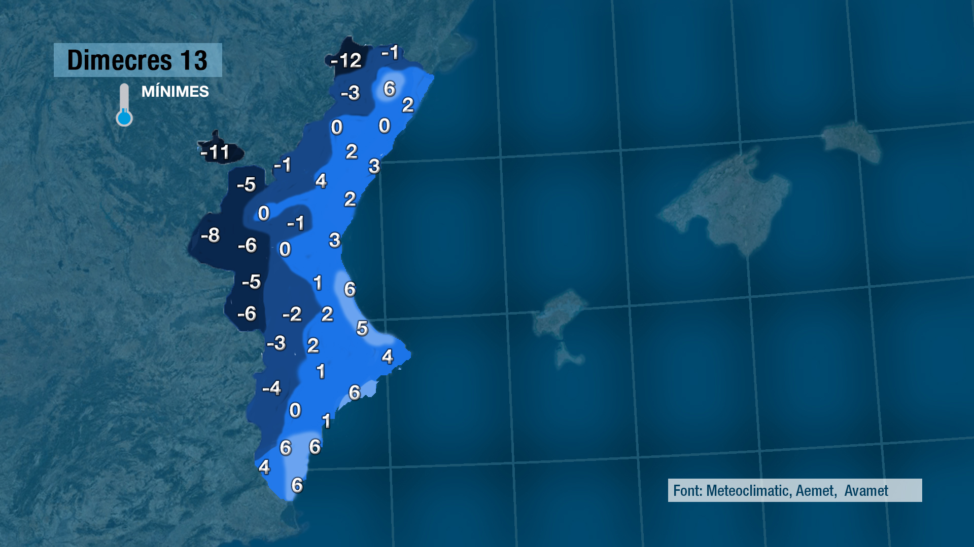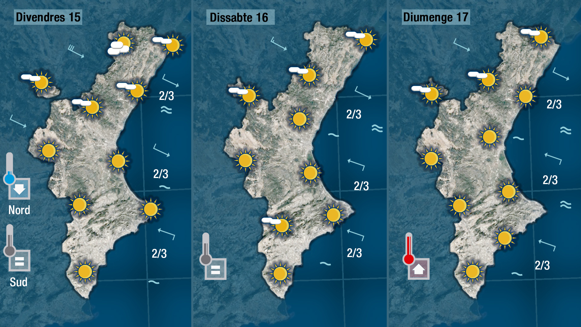 Les gelades, quedaran restringdes a l’interior i al nord on encara poden ser intenses. Le smàximes tocaran o al menys s’aproparan als 15 graus a la costa.