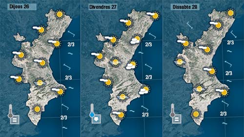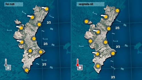 Hui encara es deixarà sentir el ponent però bufarà molt fluix, ens portarà com ahir núvols alts des de l’interior i tornarà a fer pujar les temperatures (al centre i en punts d ela costa els termòmetres arribaran als 23 o 24 graus).