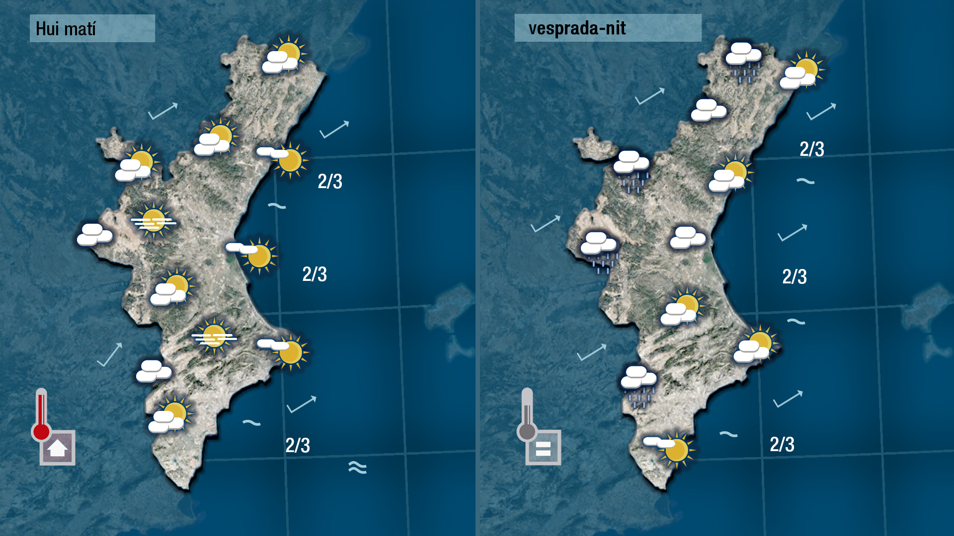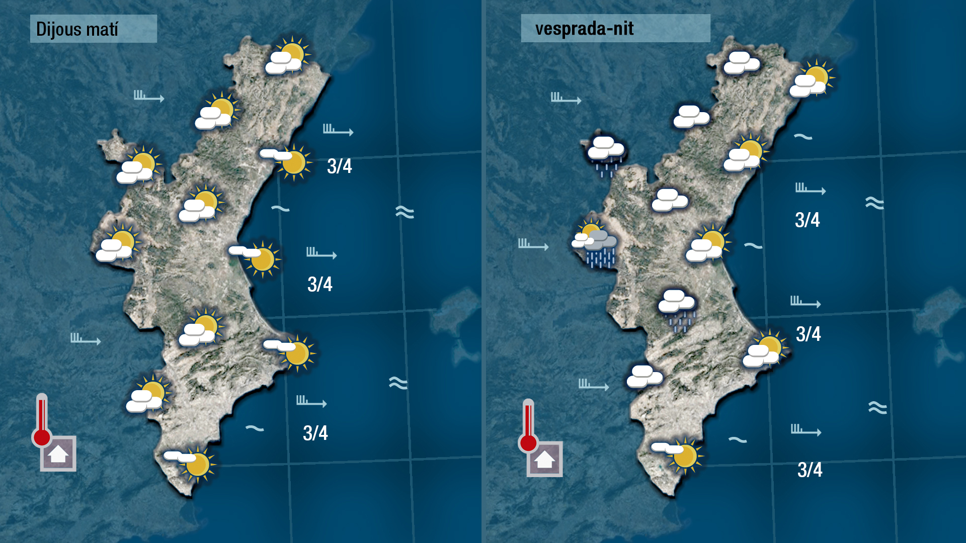 El front que acabarà de creuar la Comunitat Valenciana durant la matinada obrirà la porta al ponent demà dijous i farà pjar tant le stemperatres mínimes com les màximes. De vesprada augmentarà de nou la nuvolositat i es registren ruixats dèbils per l’interor