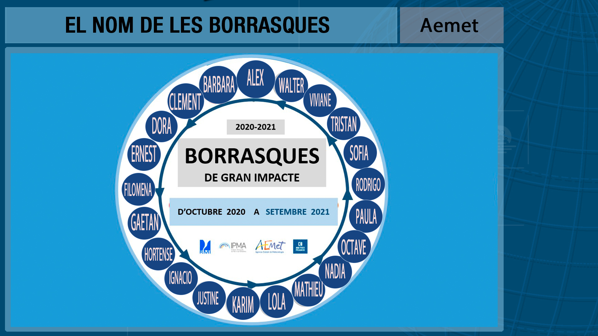 L’altre dia em preguntaven qui posa nom a les borrasques. Aemet fa el mateix que als Estats Units amb els huracans. Confecciona una llista, alternan noms masculins i femenins, que va atorgan a les borrasques que considera de gran incidència