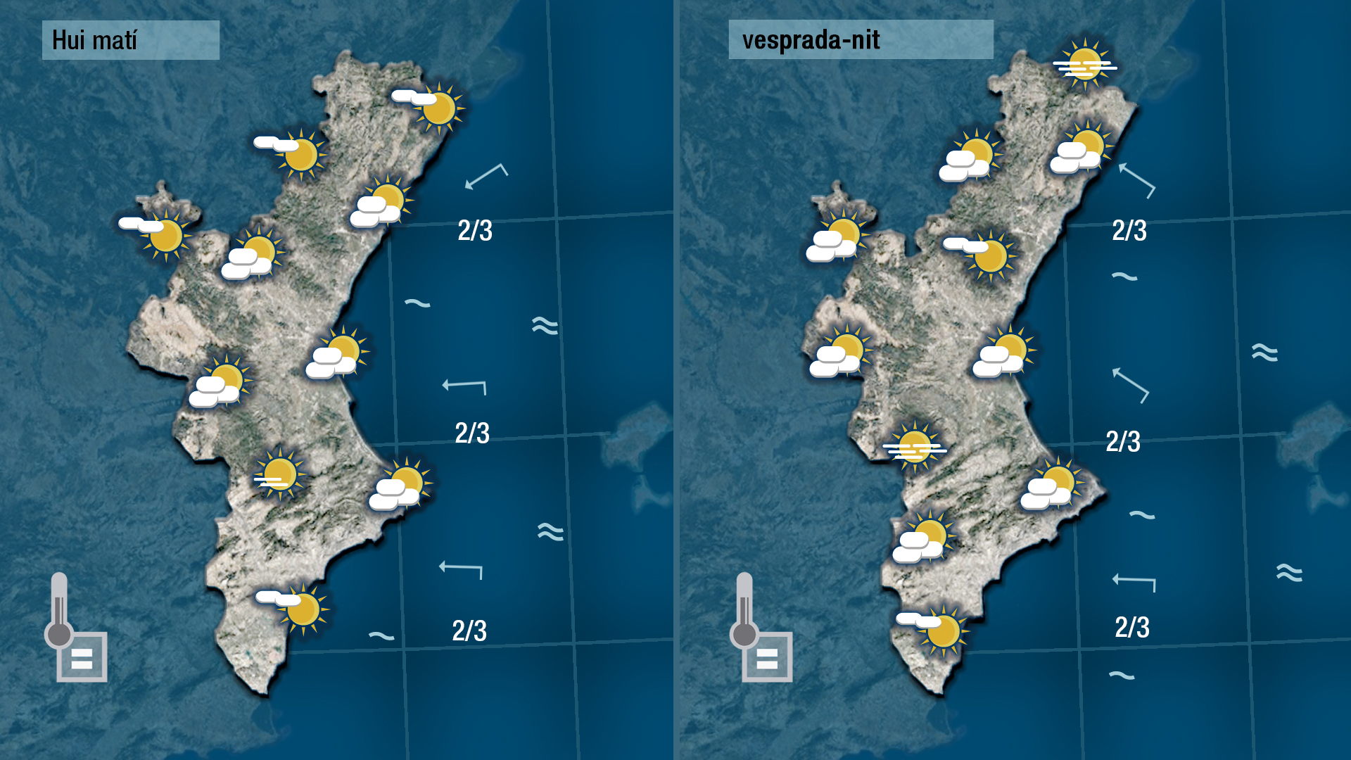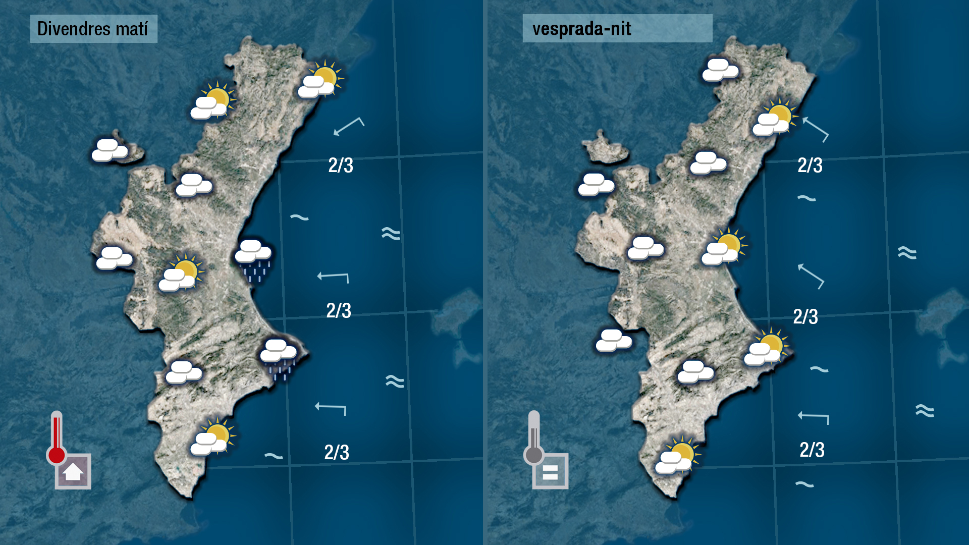 Demà divendres tindrem el cel més carregat de núvols i això farà pujar les temperatures nocturnes i baixar lleugerament les diürnes. De pluja cal esperar poca o gens, apenes algun ruixat de matí en punts d ela costa de la mitad sud de la Comunitat.