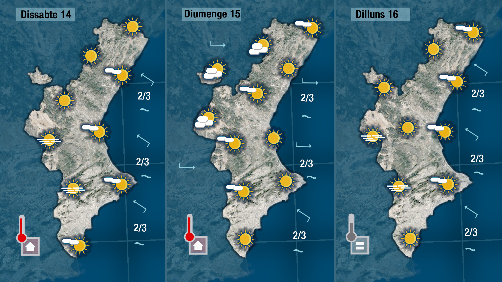 El cap de setmana podrem disfrutar del sol sense massa impediments i les temperatures pujaran tant disabte com diumenge amb valors pròxims als 25 graus). Dilluns començarem la setmana amb un ambient més fresc a la costa però amb sol i ambient suaus.