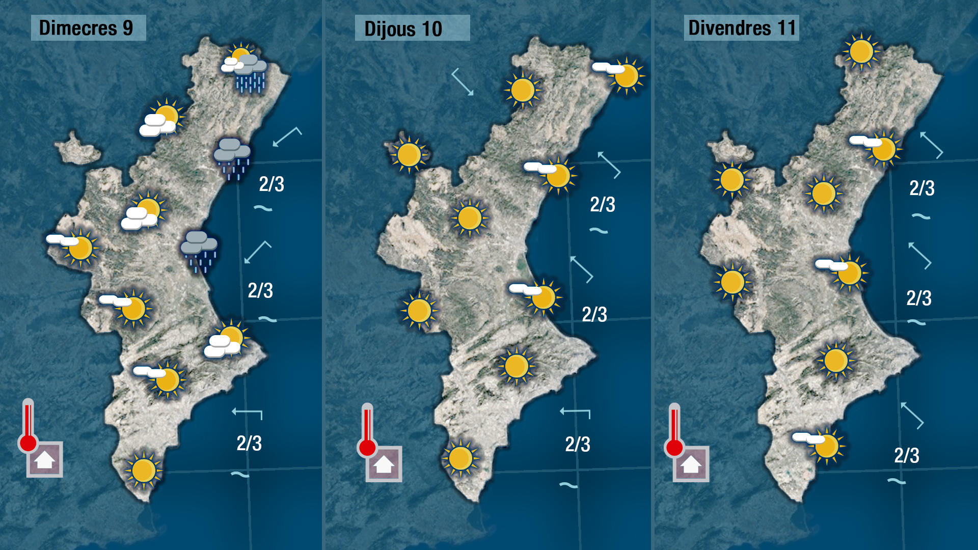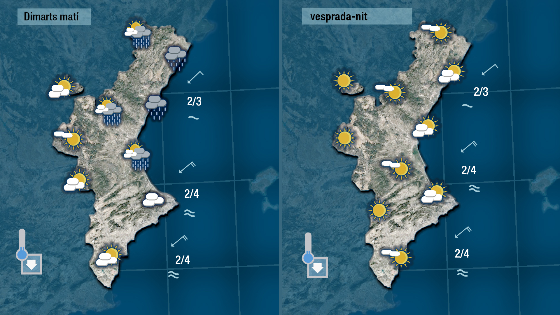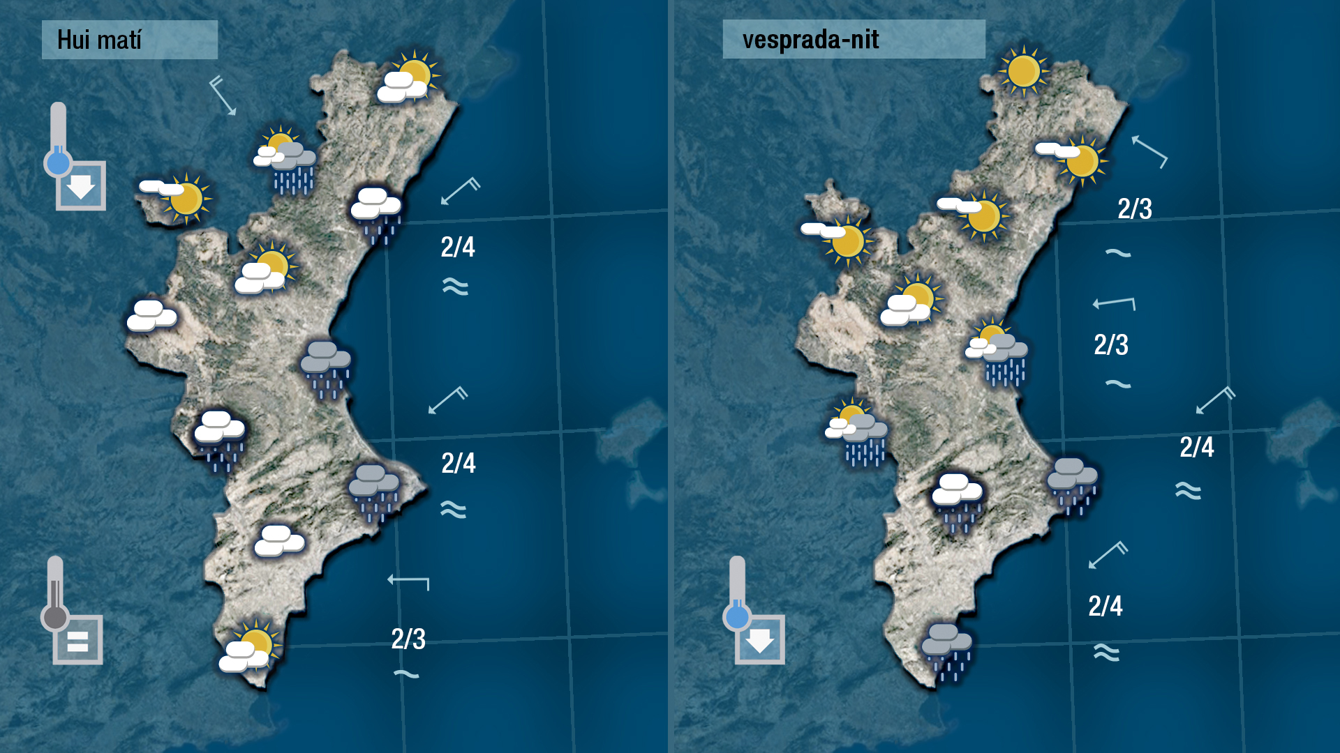 La inestabilitat avançarà hui de nord a sud. Les pluge smés intenses cal esperar-les a Castelló i nord de València fins a mig matí.