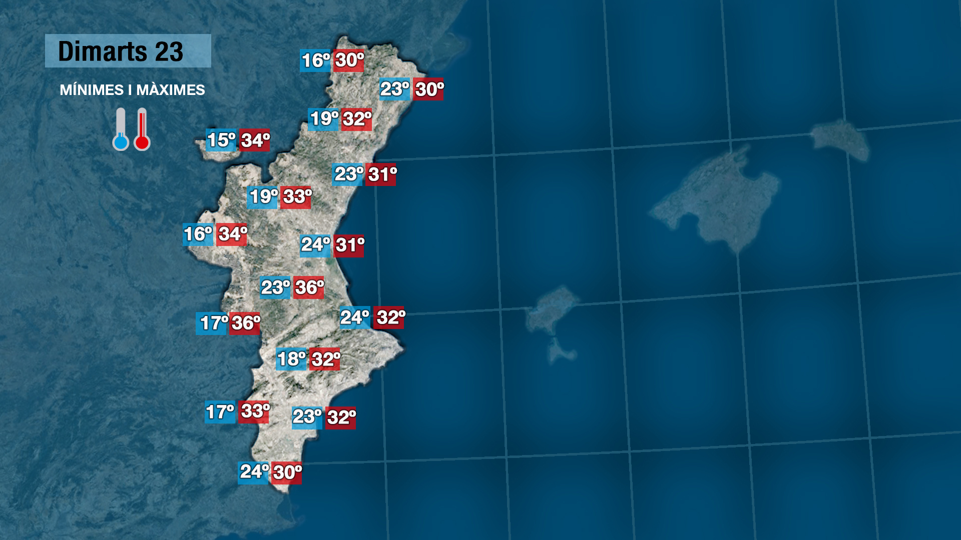 Les temperatures no patiran canvis significatius. Continuarà fent calor però tampoc exagerada. De moment no ens traiem de damunt les temperatures estivals però ens queda el consol i l’esperança que les tronades vagen a més conforme avance la setmana, que ploga amb coneixement i que no pedregue.