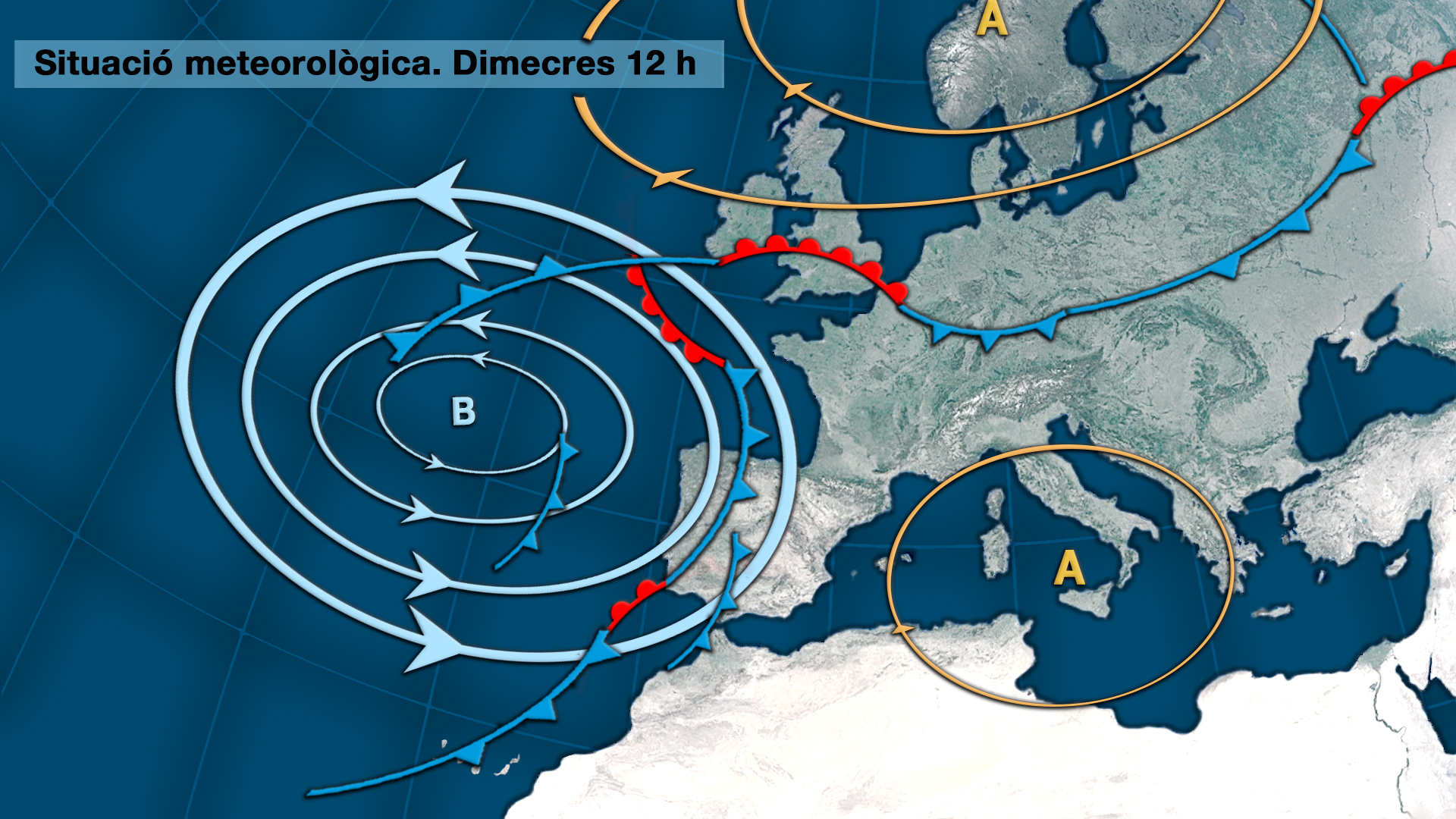 Entre les baixes pressions de l’Atlàntic i les altes del centre i l’est europeu ens envien una massa d’aire càlida que continuarà deixant les temperatures molt altes per l’època. La isoterma dels 15 graus arriba al nord d’Àfrica i la dels 20 al sud i sud-est de la Peninsula.