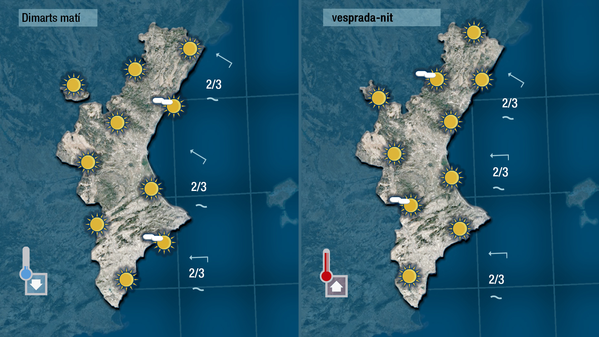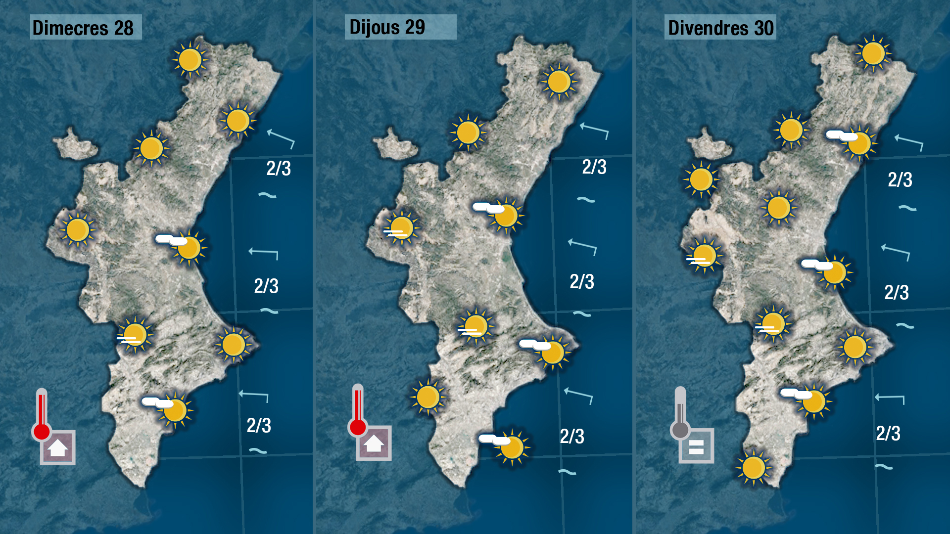 Demà dimarts recuperarem el sol ràpidament. El matí serà més fresquet (començarem el dia amb temperatures dos o tres graus més baixes) però al centre del dia pujaran dos o tres graus superant de nou els 30 graus a la major part d’observatoris, i apropant-se als 35 en punts de l’interior de València i d’Alacant.
