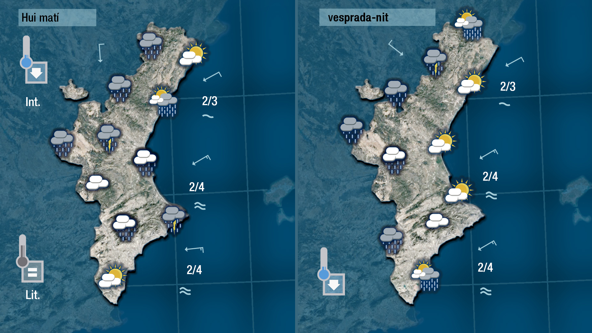 Comencem el dia atents a l’oratge i la seua evolució perquè la pluja no tardarà en manifestar-se i al llarg del matí, però sobretot al voltant del migdia, cal esperar algun ruixat de més entitat en punts de muntanya del nord i a la franja costanera del sud de València i del nord d’Alacant.