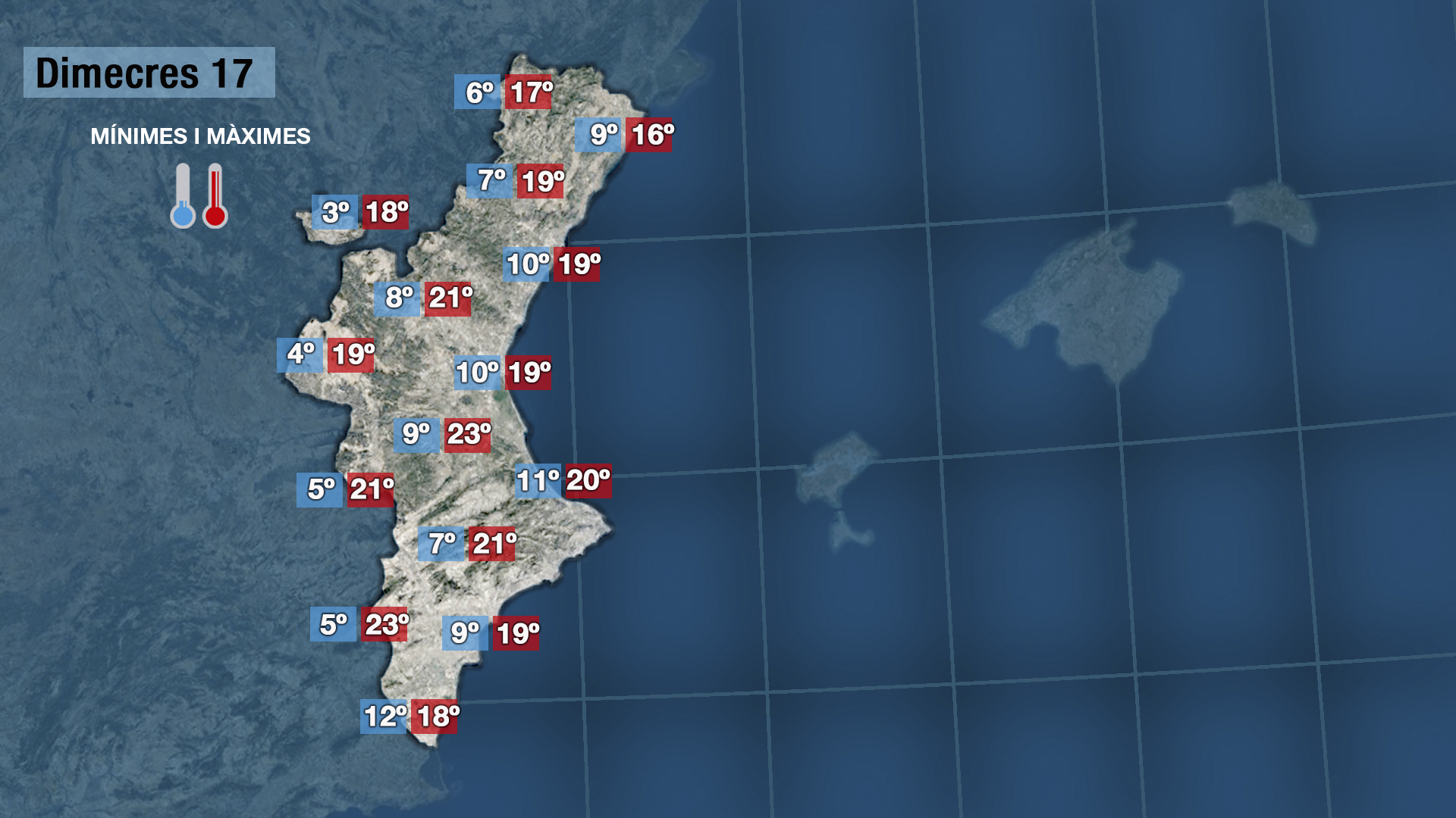 Pocs canvis cal esperar per divendres i per al cap de setmana. Pot ser divendres baixen un poc les temperatures (descens que seria més marcat a la costa), però el cap de setmana tornarien a pujar amb vents del sud i del sud-est tot i qie l’atmosfera està més tèrbola per la presència de pols en suspensió.