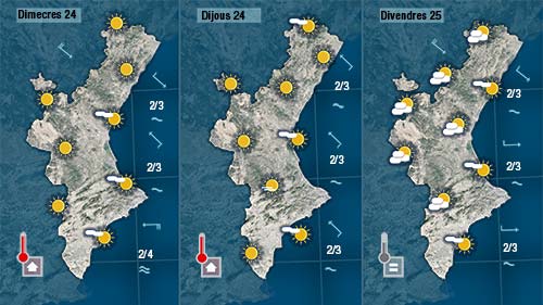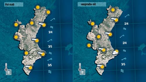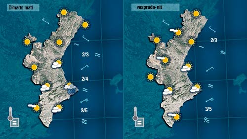 El nord-est també bufarà demà, pots ser amb menys força, però acumularà núvols al litoral del centre i sud de la Comunitat on de forma esporàdica podria registrar-se algun ruixats. Les temperatures no patiran canvis.