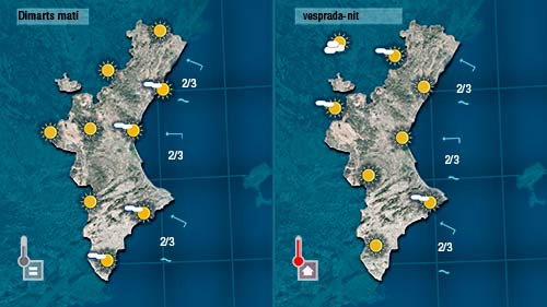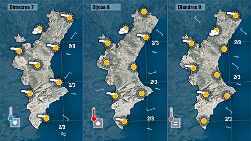Dimecres, amb més núvols i amb vents fluixos però de component més septentrional notarem un descens de les temperautes que no tindrà masa durada perquè dijous pujaran de nou les temperatures i divendres es mantindran altes