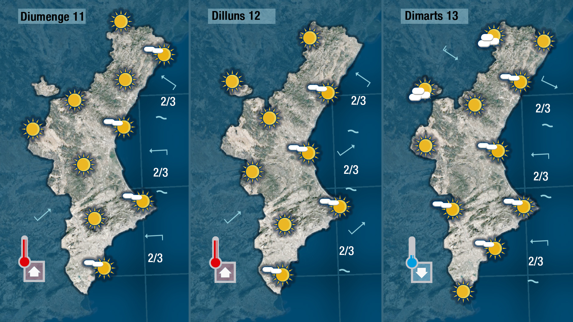 Però els dies de més calor seran diumenge i sobretot dilluns quan la massa d’aire càlida abraçarà la mitad sud de la Comunitat, tant l’interior com la costa, i quan podran registrar-se temperatures de record per a un mes de juliol.