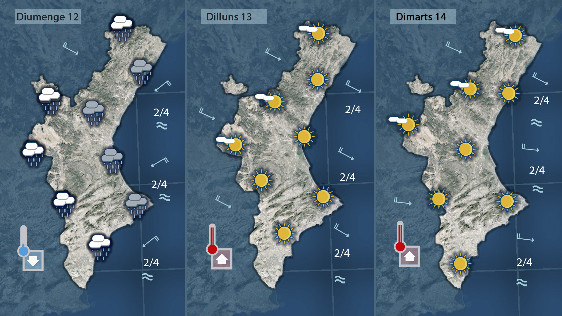 Diumenge pasarà bona part del dia plovent i l’ambient serà ben fresc. de fet no descarte que puga vore’s algun floc de neu a les muntanyes.