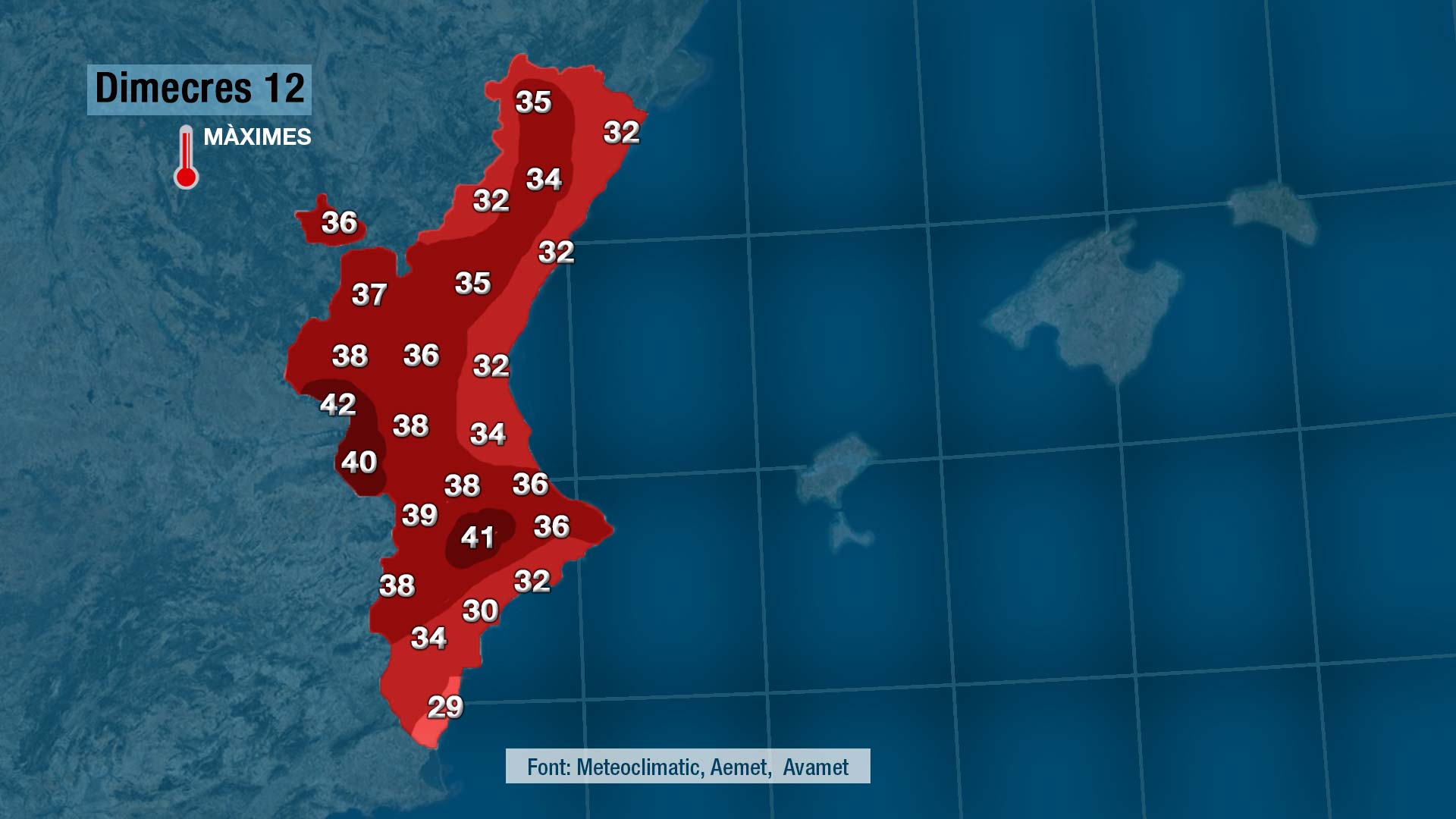 I les perspectives per a hui i els pròxims dies no es presenta massa optimista perquè la nit ha sigut molt calorosa i les màximes de hui no patiran grans canvis. Pot ser baixen un parell de graus, però calor en farà a manta.