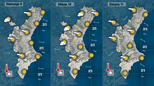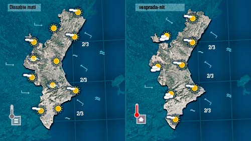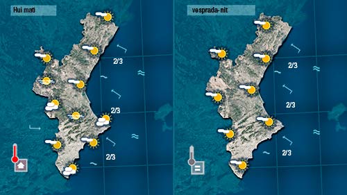 Esta nit han pujat lleugerament les mínimes i les màximes quedaran més o menys en els valors d’ahir. Tindrem pas de núvols que seran més abudants durant el matí que esta vesprada.