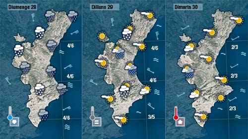 Diumenge si van cumplint-se els pronòstics el gregal i la pluja serien generals, i localment podria ploure amb insistència i intensitat en molt punts de la costa i del prelitoral. Com continuarà el descens de les temperatures la cota de neu podria baixar fins als 1.000 metres.
