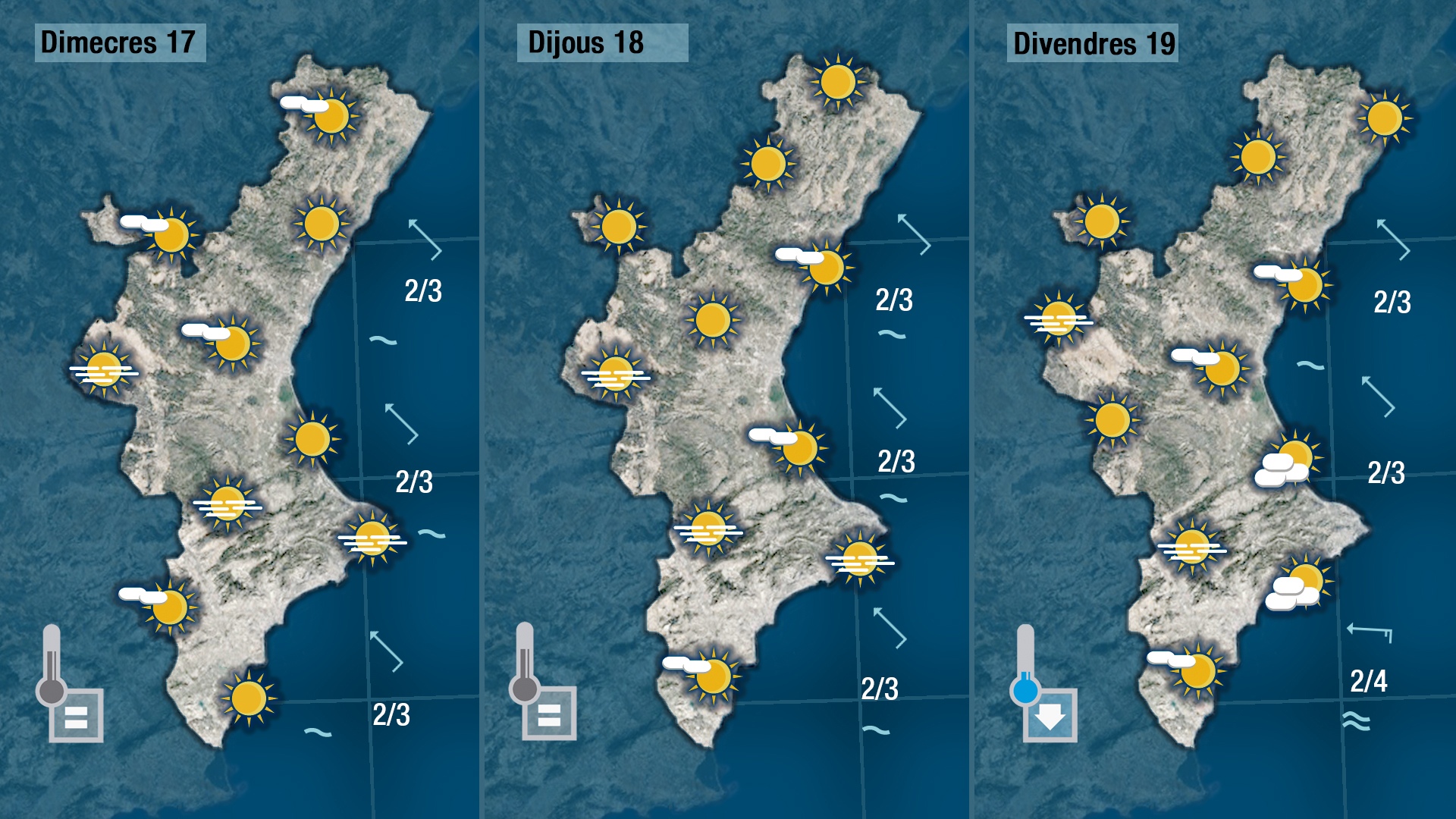 La setmana transcorrerà amb oratge estable, assolellat i amb temperatures suaus. Pot ser caldrà parar atenció a la possible formació de boires, tant en punts de l’interior com a la costa.