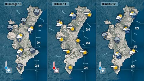 La matinada de diumenge a dilluns encara cal esperar ruixat i tronades a la mitad nord de la Comunitat però amb el pas de les hores escamparà i dilluns el dia serà asslellat i fins i tot calorós, amb temperatures pròximes als 30 graus en punts de la costa i a les comarques més centrals.