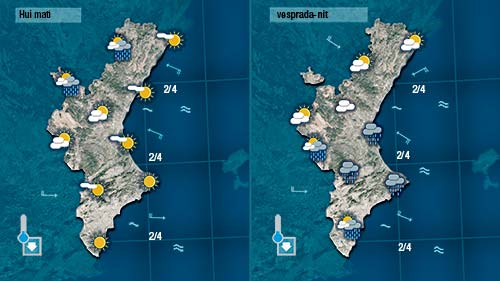Hui ja notarem els primers canvis. Pot ploure a primera i última hora del dia. De matí ho farà al nord i per l’interior, i de vesprada i apoqueta nit els núvols i la pluja avançaran des del sud.