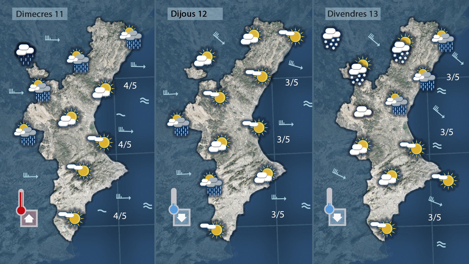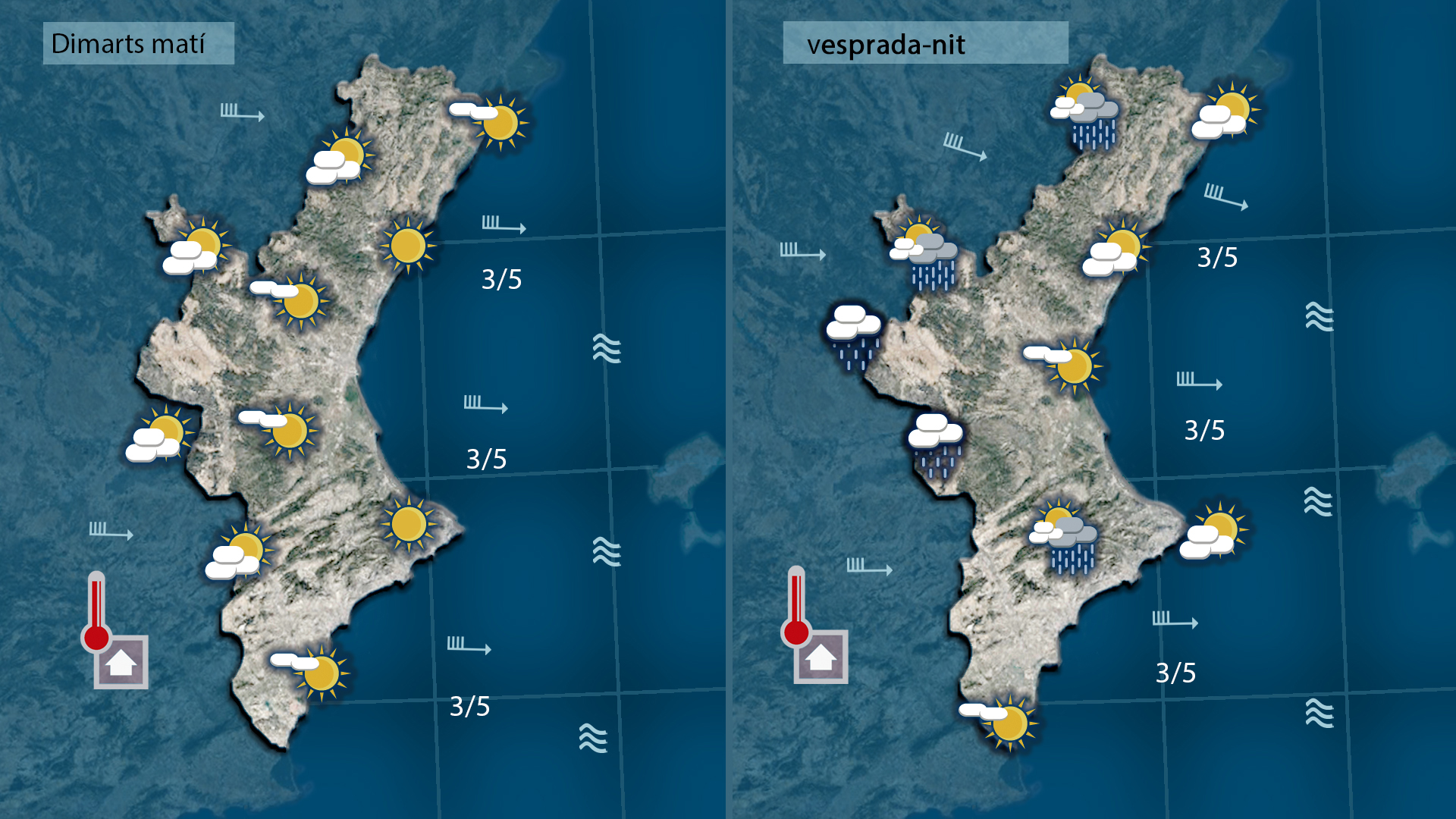 Les primeres pluges de la setmana es registraran hui mateix perquè durant la nit i matinada el cel ha quedat més cobert i les pluges han començat a tocar les comarques més interiors. Durant el matí continuarem amb la desfilada de núvols de ponent a llevant que deixaran pluges de caràcter dèbil per l’interior i ruixats dispersos a la costa. De vesprada farà més sol i les temperatures, que esta nit ja han quedat més altes, també voldran pujar al centre del dia.
