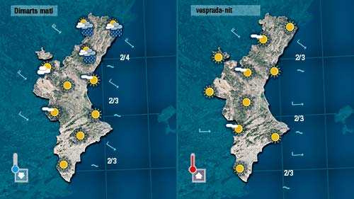 Demà de matí encara podria registrar-se algun ruixat al nord però de seguida escaparà la nuvolositat imposant-se el sol per tot arreu. El dia començarà més fresc però de vesprada amb vents fluixos de ponet les temperatures pujaran al centre i ala costa.