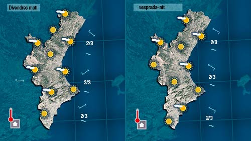 Demà divendres encetem un nou llarg cap de setmana que vindrà marcat per l’estabilitat i les altes temperatures. Al cel només alguns núvols decoratius i als termòmeres valors aprop o tocant els 30 graus. Fins a migdia el vent bufarà fuix de component oest, girant a xaloc (sud-est) de vesprada.