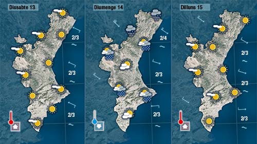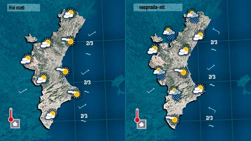 Vents que tenen molt recorregut terrestre i que com el ponent sempre fan pujar les temperatures a la Comunitat Valenciana. Portarà núvols mitjans i alts que només de forma puntual podrien deixar alguna gota de vesprada per l’interior.