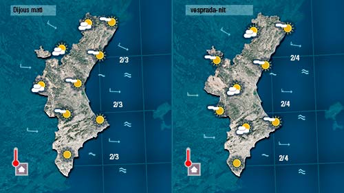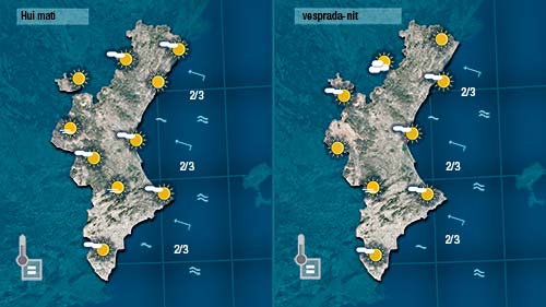 L’oratge de hui serà molt semblant al d’ahir. Pot ser que en punts del centre i de l’interior ponent i encara puguen més les temperatures. A la costa es deixarà sentir el xaloc i els termòmetres pujaran fins als valors d’ahir.