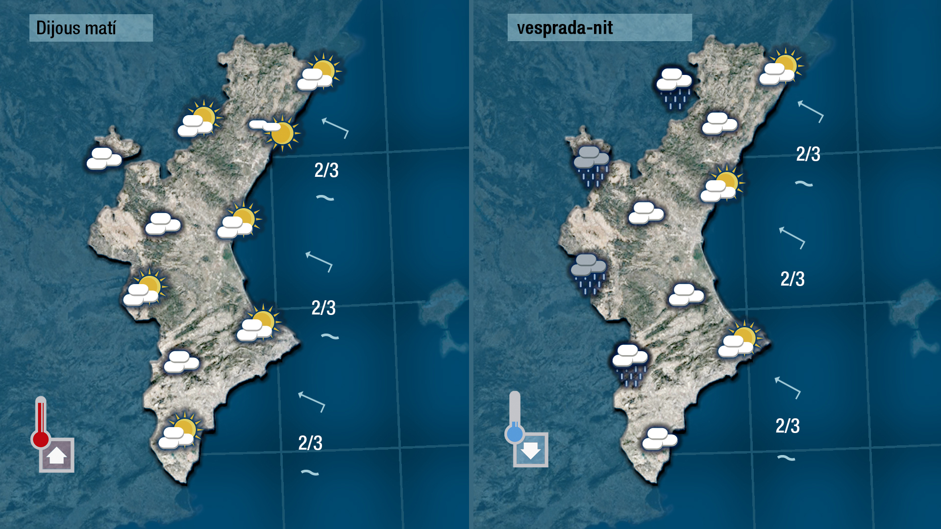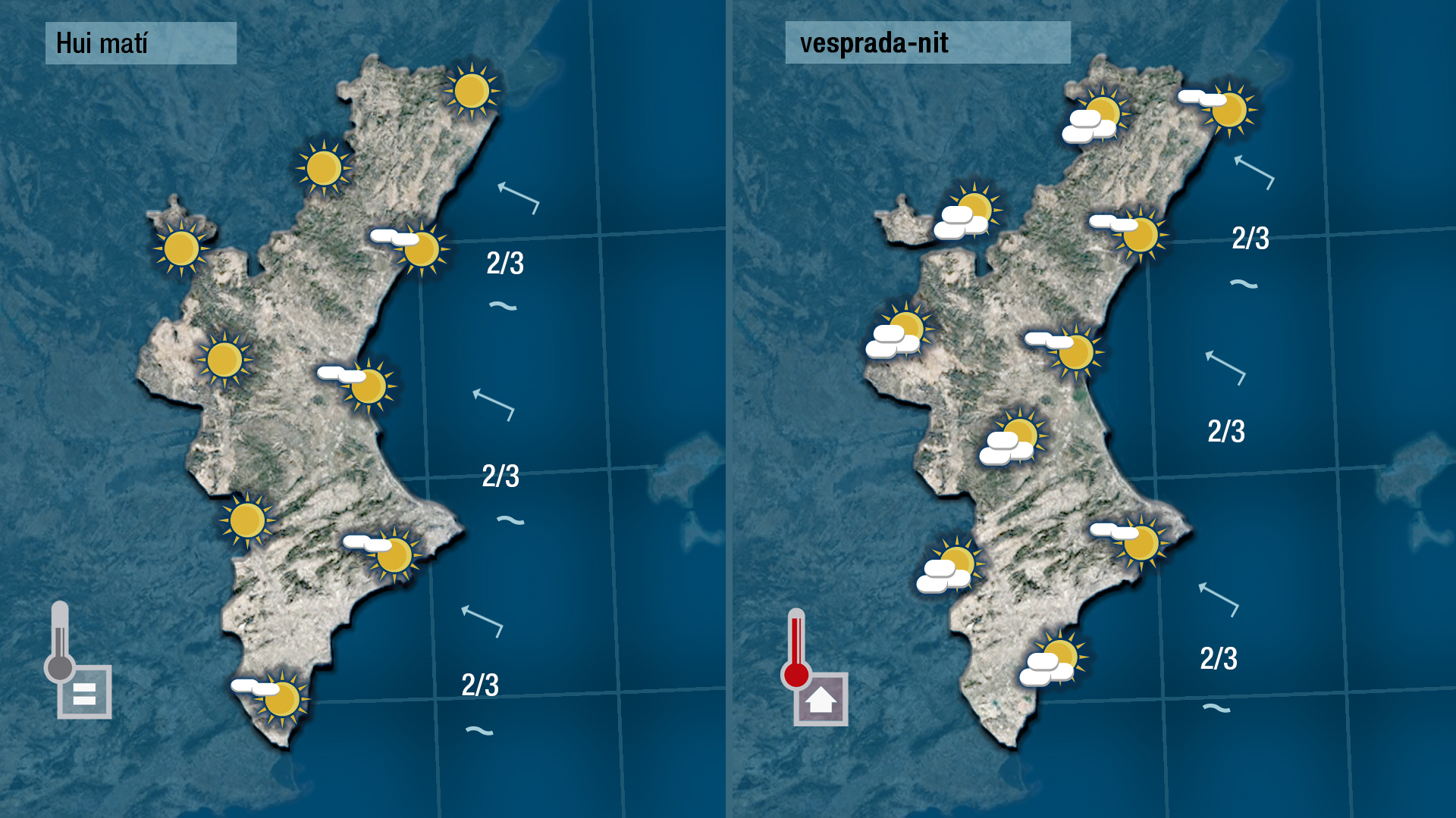 El de hui encara serà un dia marcat per l’estabilitat i la calor. El matí, tret d’algun núvols baixos que vorem junt a la costa, serà assolellat. De vesprada vorem més núvols però ni deixaran pluja ni tapaan de tot el sol afavorint un lleuger ascens de les temperatures.