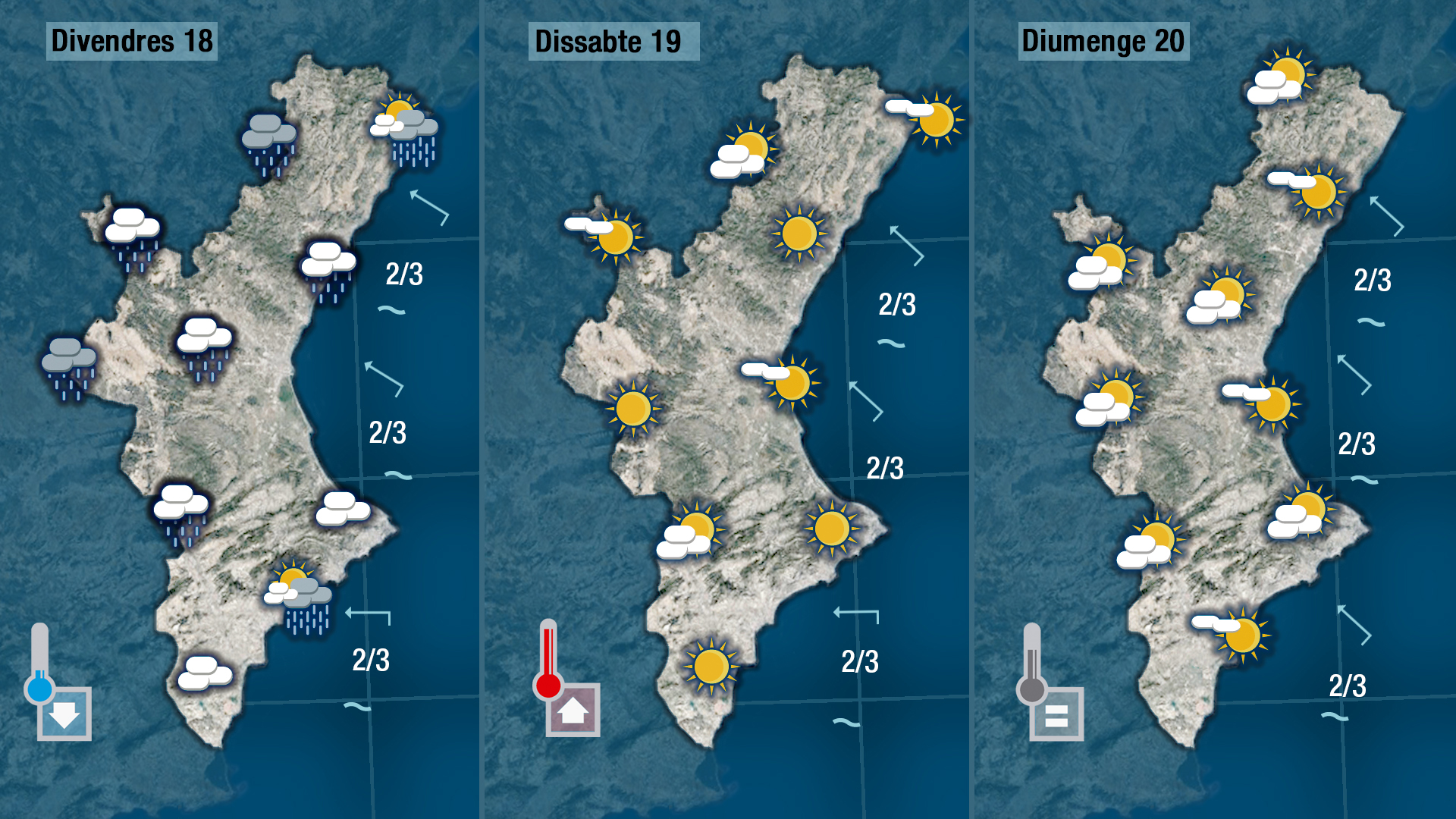 Pense que divendres  que ens espera un dia gris i plujós a la major part del territori. En arribar els núvols des de l’oest de la Península serà molt difícil que les pluges siguen quantioses però segur que seran benvingudes perquè comença a fer falta que ploga.