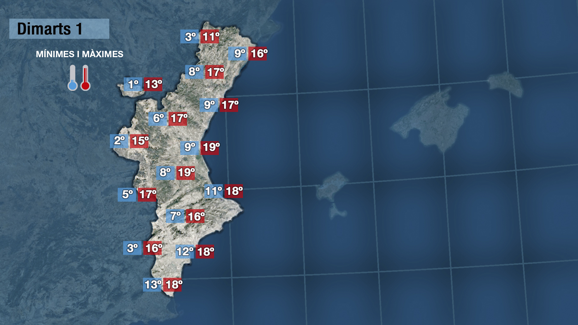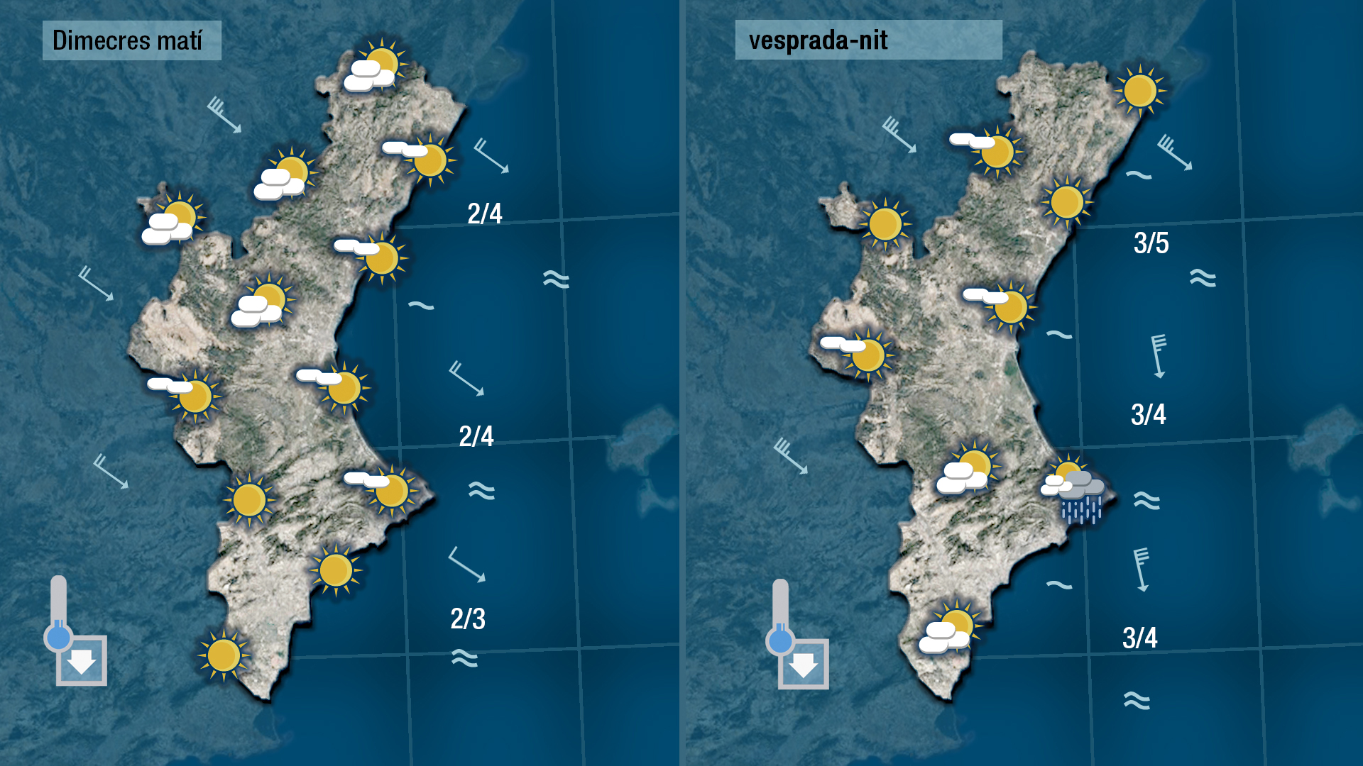 La nit de dimecres a dijous el vent quedarà prou encalmat i això farà que les temperatures nocturnes siguen hivernals a tota la Comunitat. Gelarà en punts de l’interior, al centre les temperatures registraran valors pròxims als zero graus i ala costa no passaran molt dels 5.
