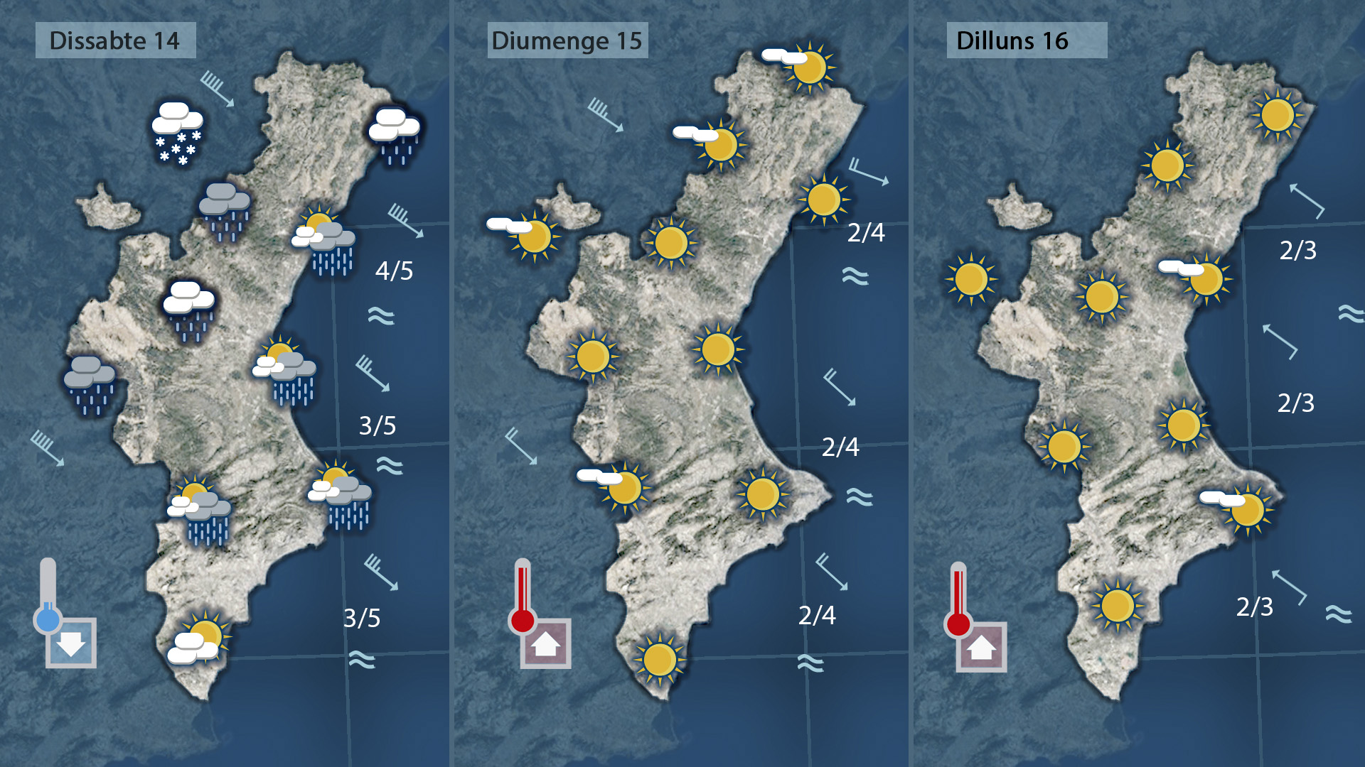 Dissabte serà un dia ventós i fresc (o fred). El mestral es deixarà sentir sobretot al nord de la Comunitat però serà un maldecap a tota la Comunitat i especialment als municipis fallers. Tindrem pas de núvols i perquè vos feu una idea del descens tèrmic que anem a tindre la neu es deixarà vore al bvoltant dels 1.000 metres.