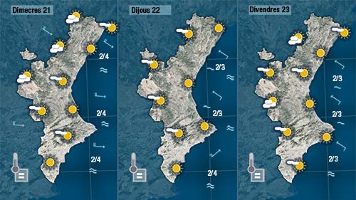 Dijous i divendres no cal esperar novetats. Tindrem pas de núvols que seran més compactes al nord i per l’interior però en principi no esperem que ploga. Les temperatures tampoc patiran grans canvis.