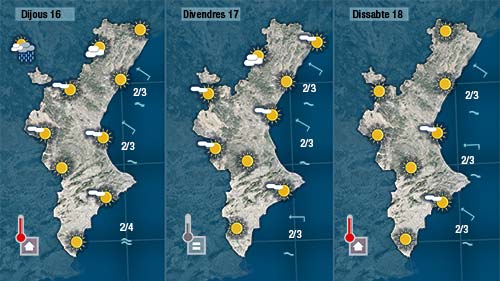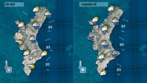 Espere les primeres precipitacions al litoral i prelitoral de la mitad nord de la Comunitat cap a mig matí (a migdia a molt tardar). Els núvols i la inestabilitat aniran guanyant terreny i acabaran afectant bona part del territori. Pot ser de cara a la nit escampe un poc al nord però al centre i al sud la nit podria ser moguda i tempestuosa.