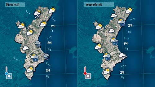 S’espera que les pluges siguen més generals i abundants durant el matí i que comencen  a escampar a partir de migdia i durant la vesprada. Les temperatures més més altes n quedaran entre els 13 i els 15 graus.
