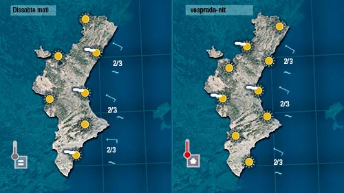 Demà dissabte serà un dia dominat pel sol. Pense que només vorem núvols a la costa a primera i última hora del dia i a les rodalies de les muntanyes algun núvol solt de vesprada. Demà farà més calor