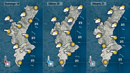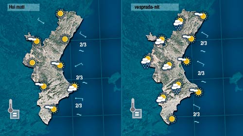 A primera hora tindrem núvols baixos que han sigut els responsables de mantindre altes les temperatures nocturnes. Cap a migdia augmentarà la nuvolositat i no descarte que esta vesprada puga registrar-se algun ruixat dèbil, sempre més probable al centre i per l’interior. Les temperatures no patiran grans canvis