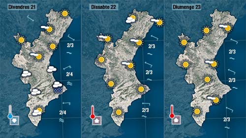 Divendres l’oatge serà molt diferent entre el nord i el sud de la Comunitat. Mentre al nord bufarà mestral, es vorà més el sol i les temperatures no patiran grans canvis. Al sud tindremel cel més cobert, podrà ploure dèbilment i tornaran a baixar les temperatures.