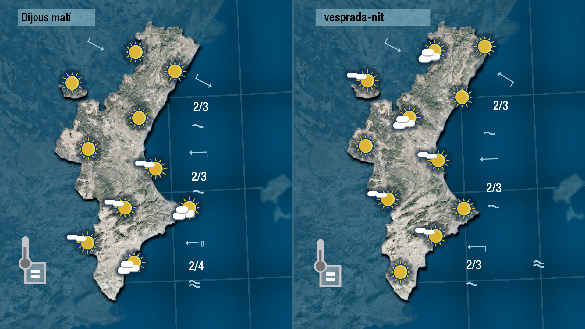 Pocs canvis cal esperar per a demà dijous: alguns núvols al cel de la costa en començar el dia i nuvolades sense conseqüències ales muntanyes de vesprada, i temperatures sense canvis.