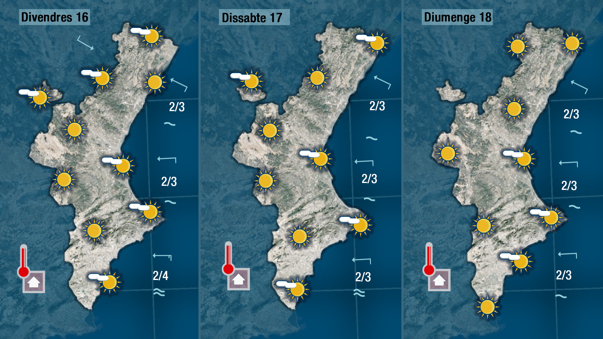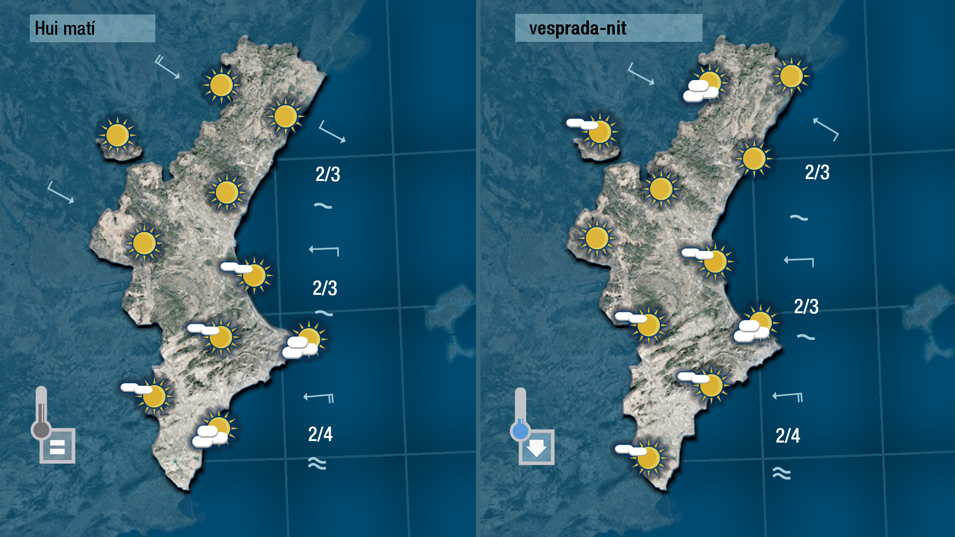 El llevant es deixarà sentir hui amb força al sud, on la mar quedarà més alterada i es voran núvols baixos, sempre més abundants a primera i última hora del dia. Les temperatures no patiran grans canvis al centre i per l’interior, on el valors més alts pujaran fins als 32 o 33 graus, i a la costa quedaran un parell més baixes que ahir.